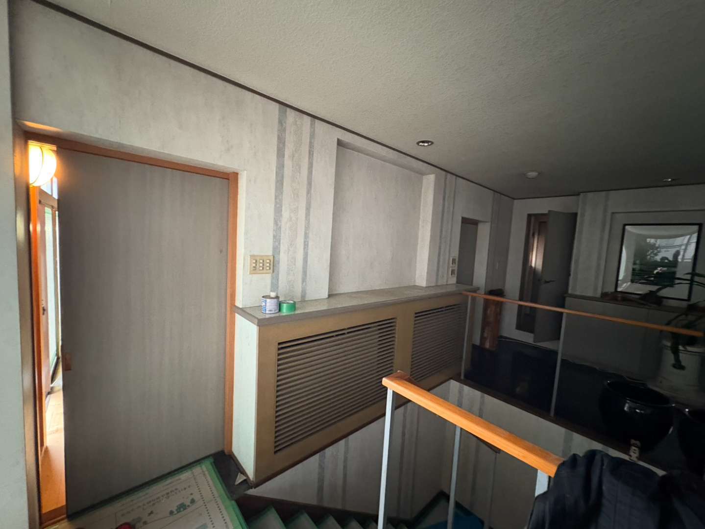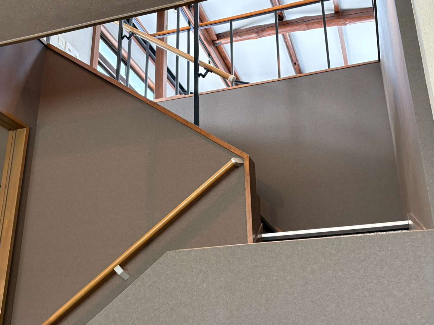 施主様から「既存の梁をあえて見せたい」というご要望をいただき、下の階からでも梁を眺めることができる吹き抜け風のデザインをご提案しました。